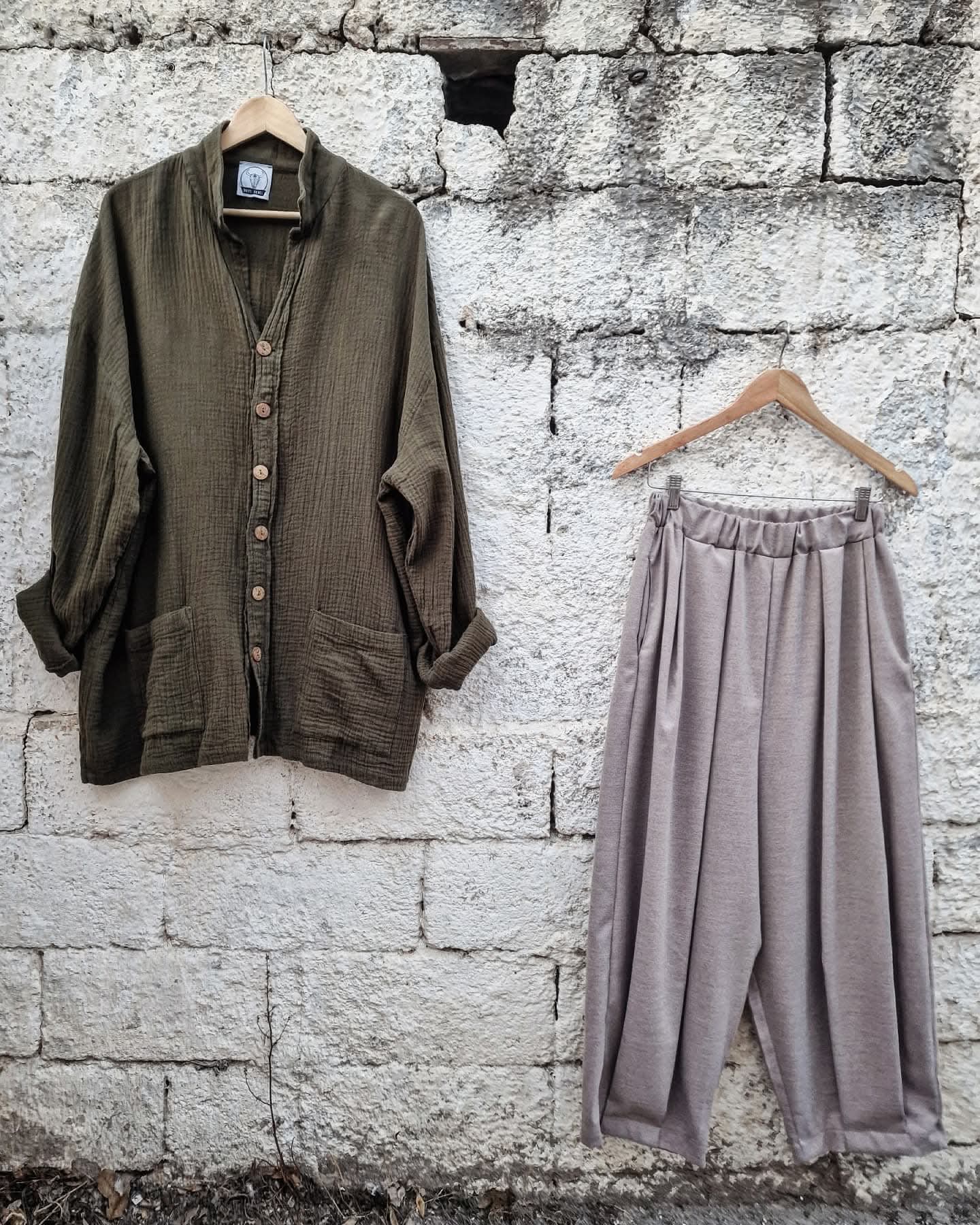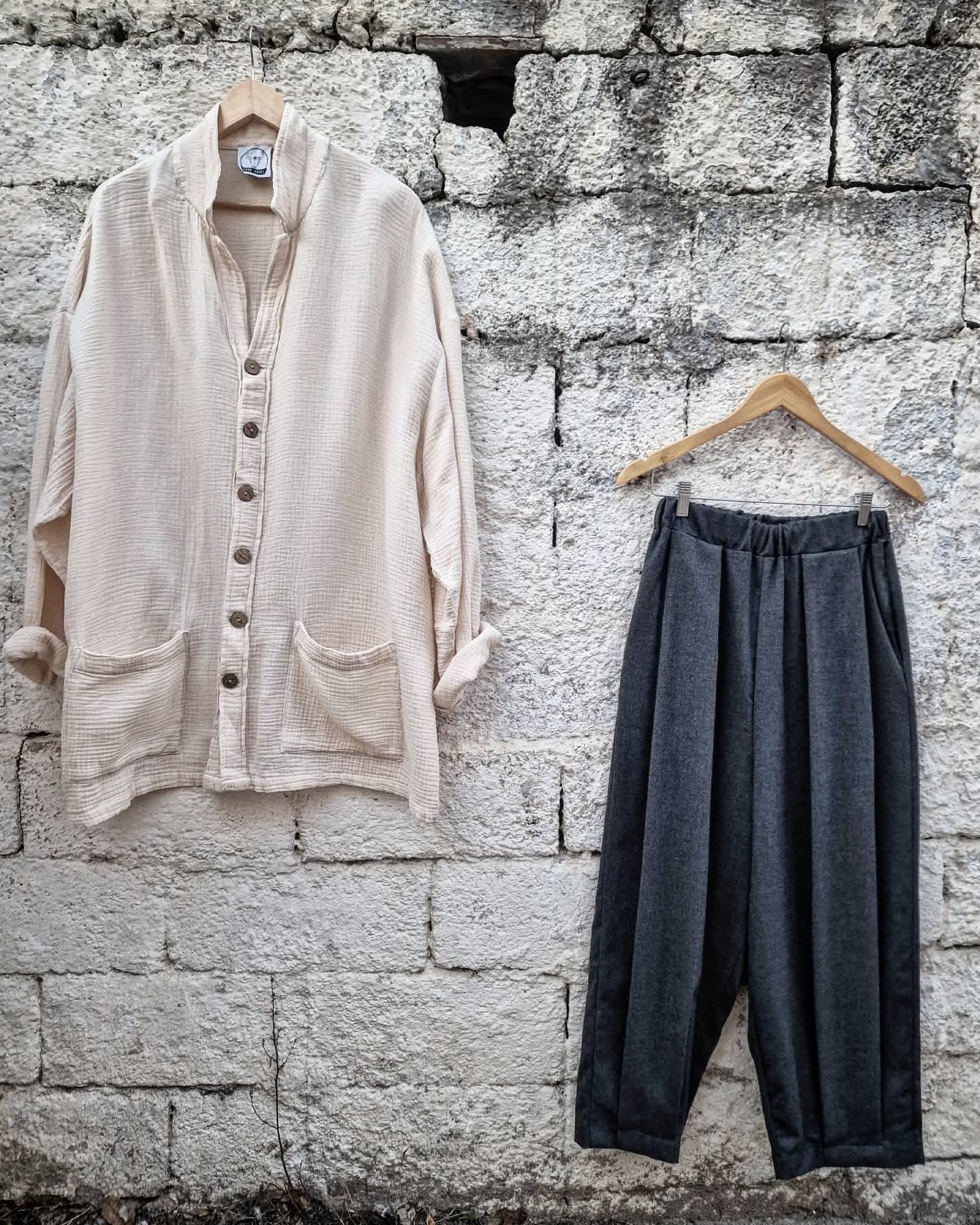 Harold trousers one size oversized features an elastic waist and 2 front pockets, as well as pleats at the top and bottom, ideal for comfortable looks