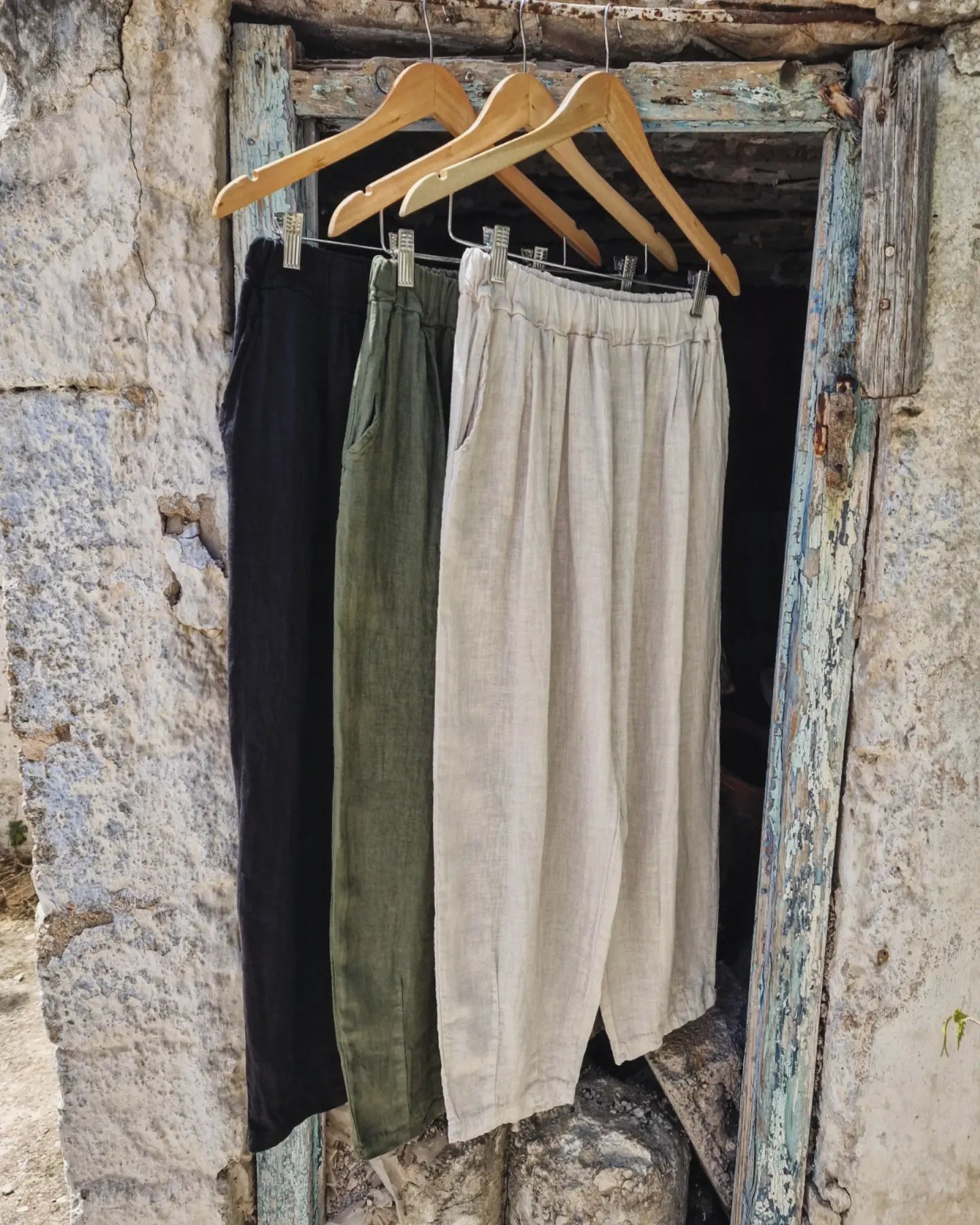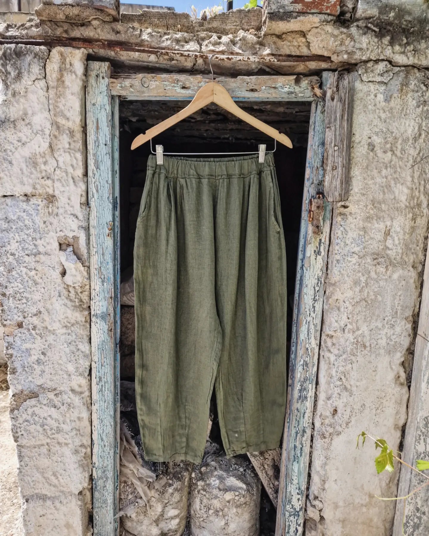 The Paseka pants are made of linen fabric in a comfortable fit. They feature an elastic waistband for a better fit and comfort, as well as two diagonal pockets on the front for practicality and style.
