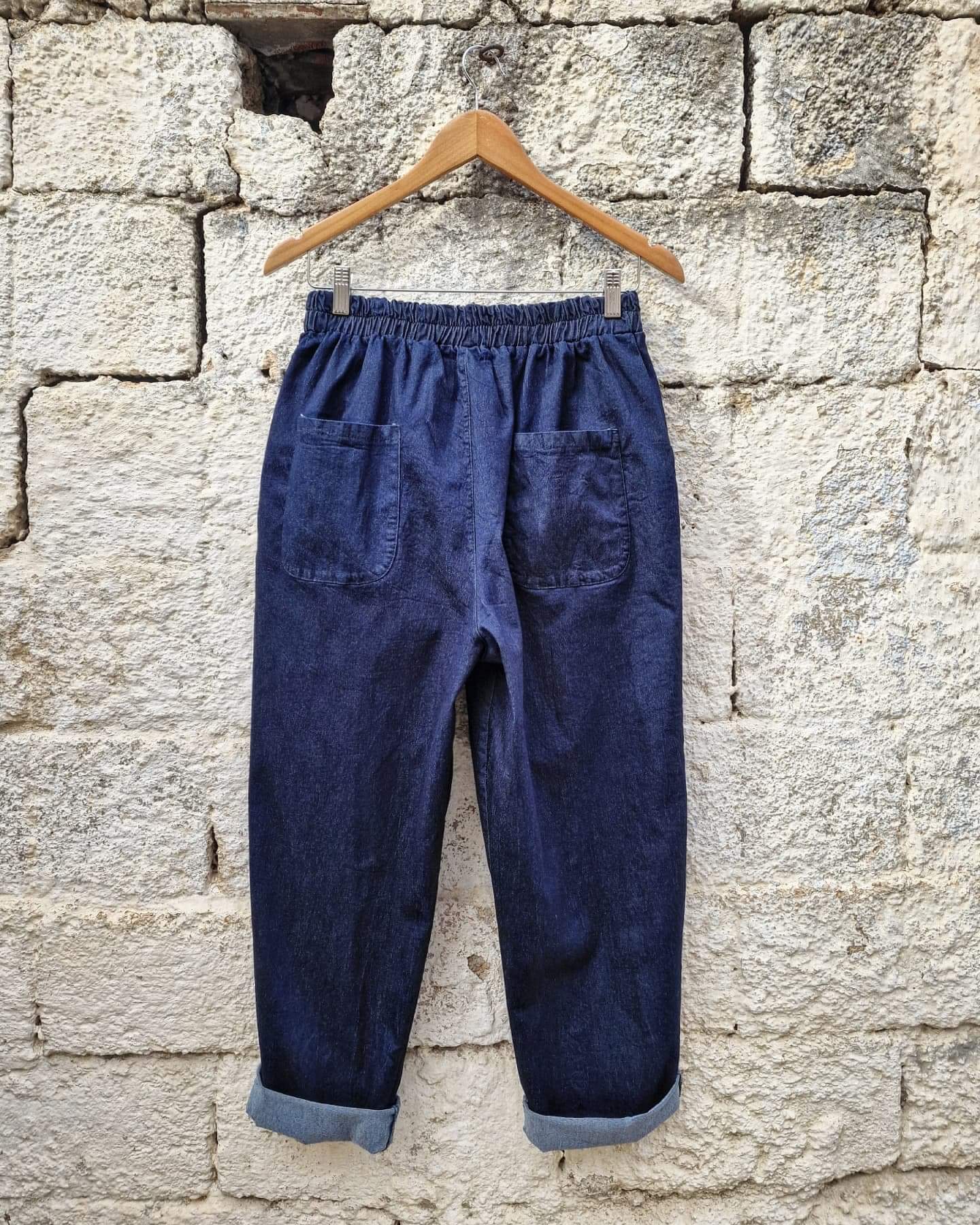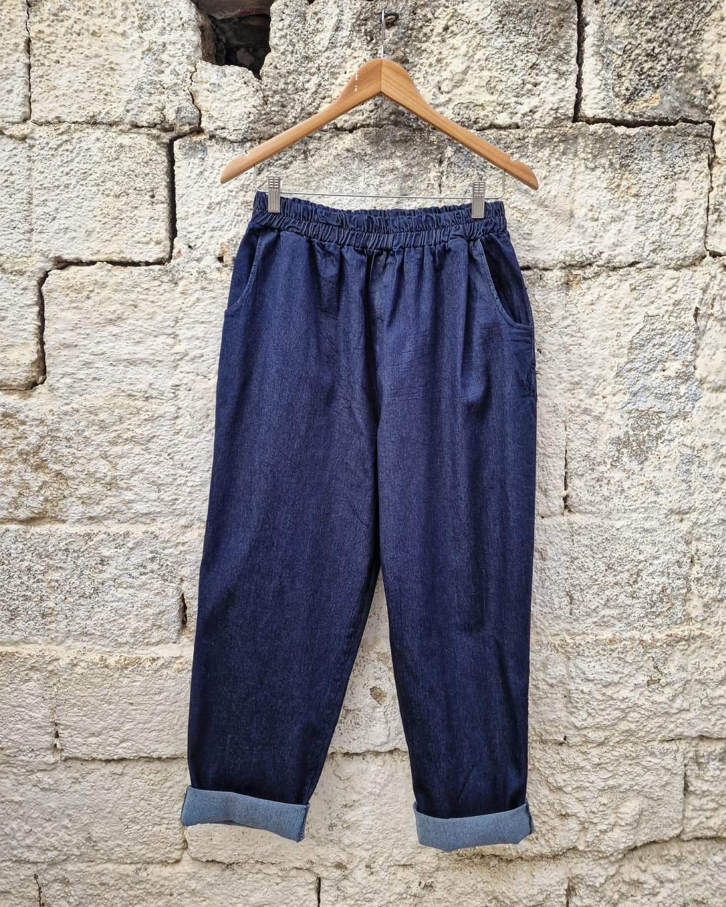 Afran jean παντελόνι σε άνετη γραμμή με λάστιχο στη μέση, 2 τσέπες μπροστά και 2 τσέπες στο πίσω μέρος. Ένα boho βαμβακερό παντελόνι για άνεση και στυλ σε κάθε σας εμφάνιση.