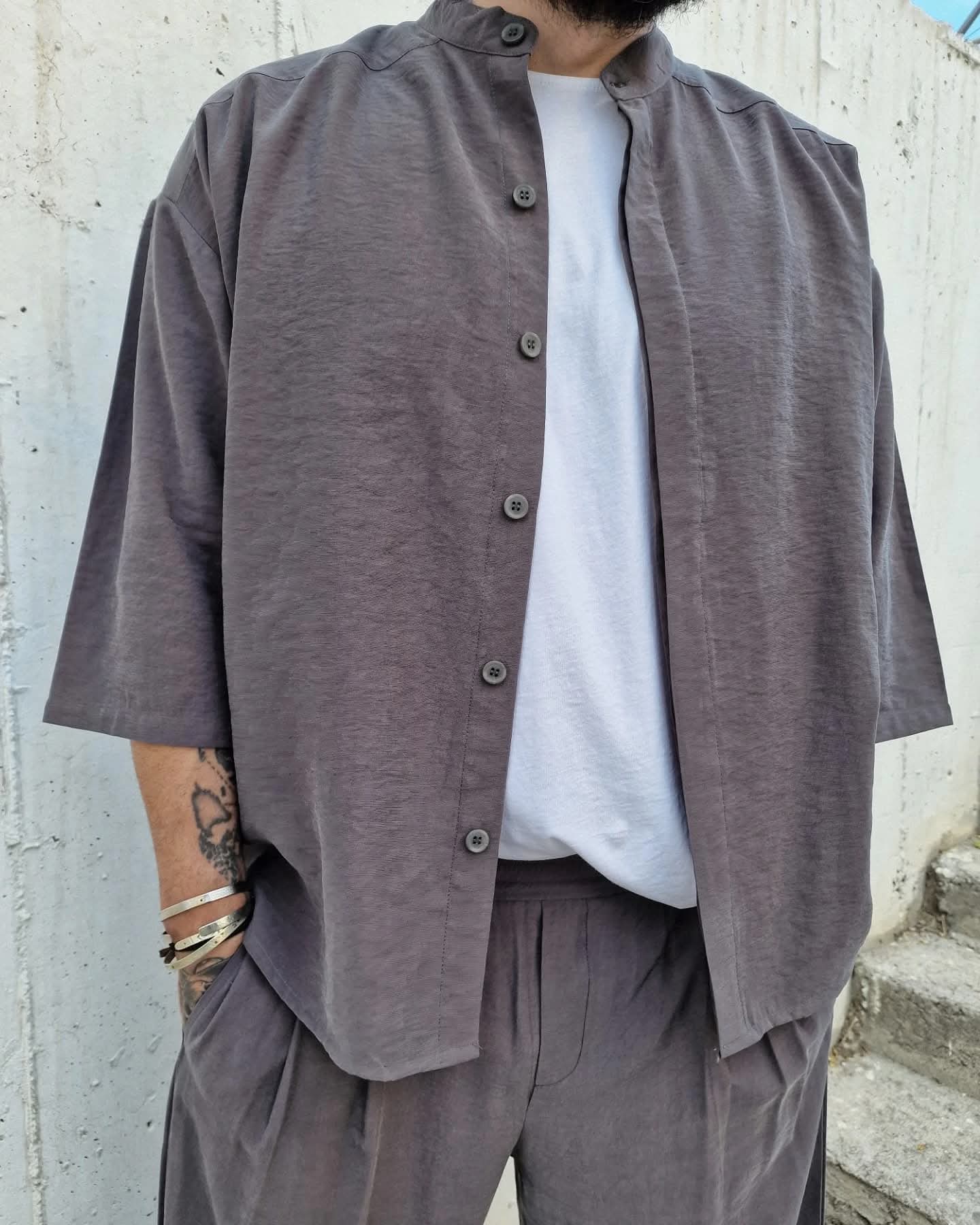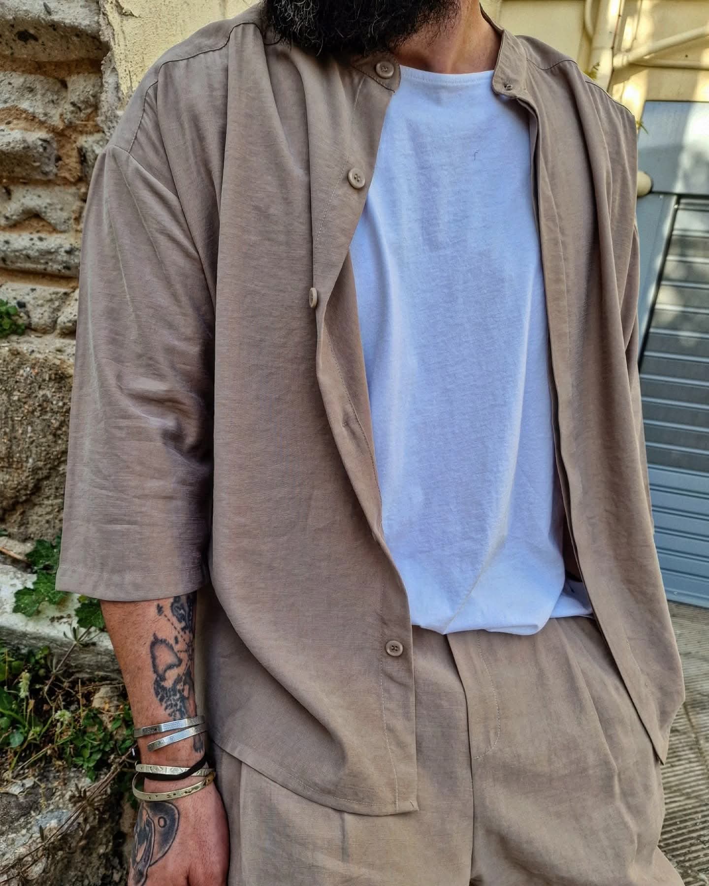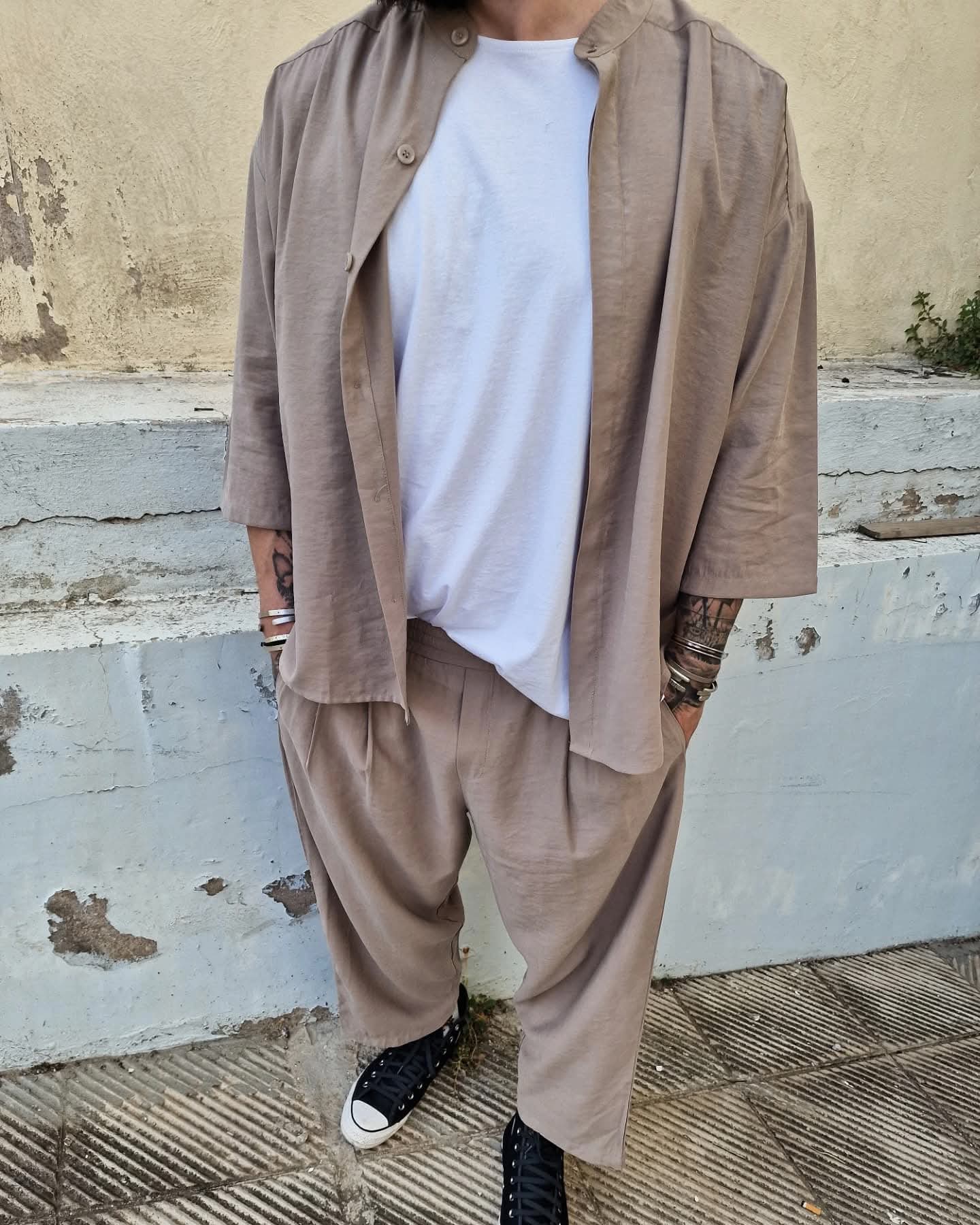 Dael σετ παντελόνι και πουκάμισο σε κανονική προς άνετη γραμμή διατίθεται σε δύο νούμερα .Το παντελόνι διαθέτει λάστιχο στην μέση καθώς και δύο τσέπες διαγώνια μπροστά και δύο στο πίσω μέρος .Το σετ της φωτογραφίας είναι ελληνικής ραφής και διατίθεται αποκλειστικά στην ιστοσελίδα μας.