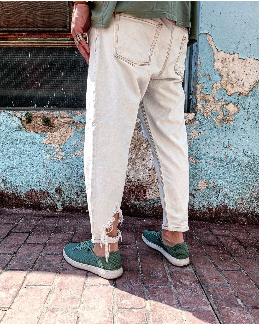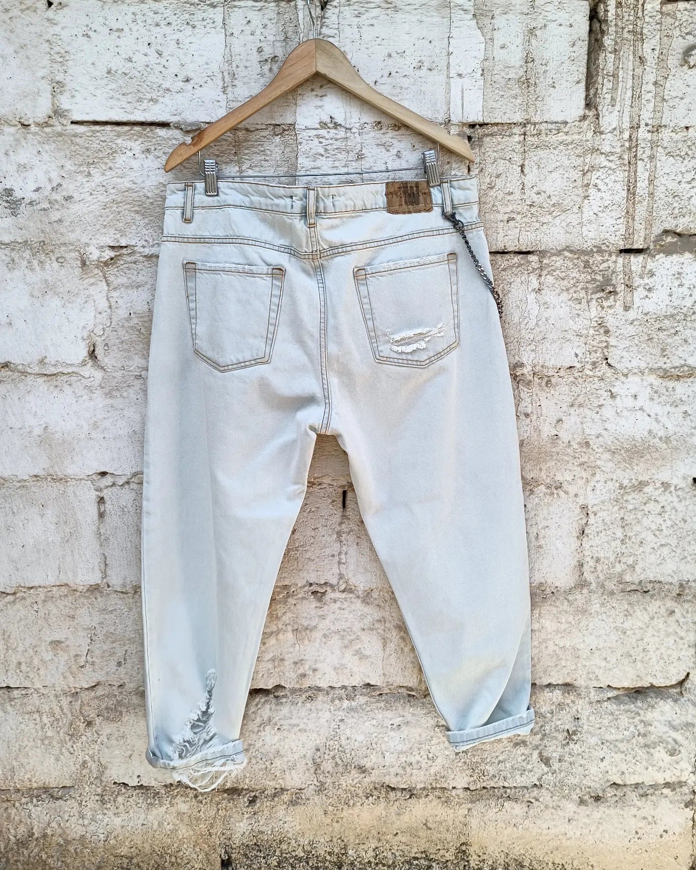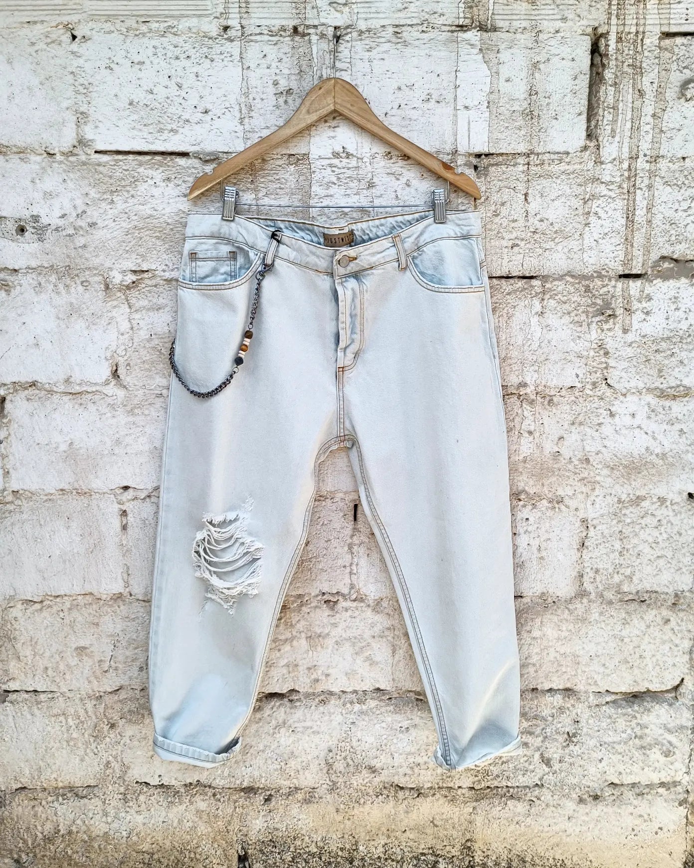 Το Majorca τζιν παντελόνι με κανονική γραμμή διαθέτει 2 διαγώνιες τσέπες μπροστά και 2 πίσω, μαζί με ένα ιδιαίτερο σκίσιμο στο τελείωμα. Η μέτρηση είναι ιταλικής προέλευσης. Το τζιν έχει ανοιχτό χρώμα, προσφέροντας ένα εντυπωσιακό στυλ με βαμβακερό ύφανση, που το καθιστά την ιδανική επιλογή για καλοκαιρινές εμφανίσεις.